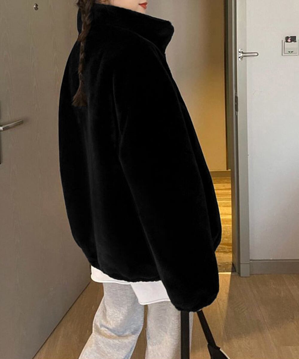 ジッパーボアブルゾン薄中綿 ふわふわボアカーディガン 暖かい モコモコフリースジャケット カジュアル ハイネックアウター